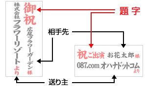 札には「題字」、お花を贈られる「相手先」のお名前、お花を贈る「送り主」様のお名前を表記します。
