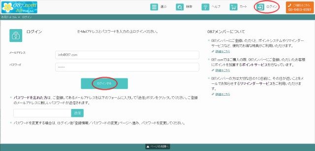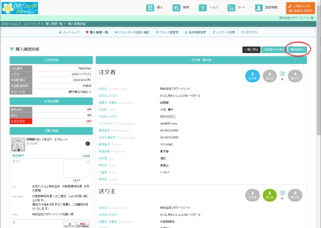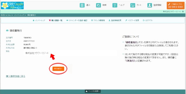 087メンバーログインのご注文履歴から領収書の電子発行(PDF)が可能です。