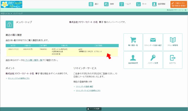 2. [メンバートップ] の「最近の購入履歴」より該当の注文を選択する。